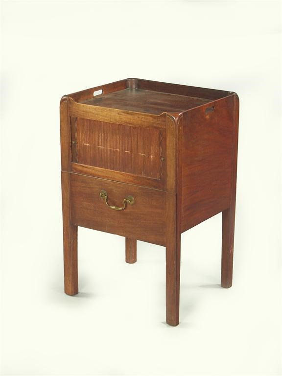 A George III mahogany 'tray top' bedside commode, with a tambour shutter and a vacant pull-out base, 31in (78.6cm) h, 20in (50.8cm) w, 17.5in (44.5cm) d.