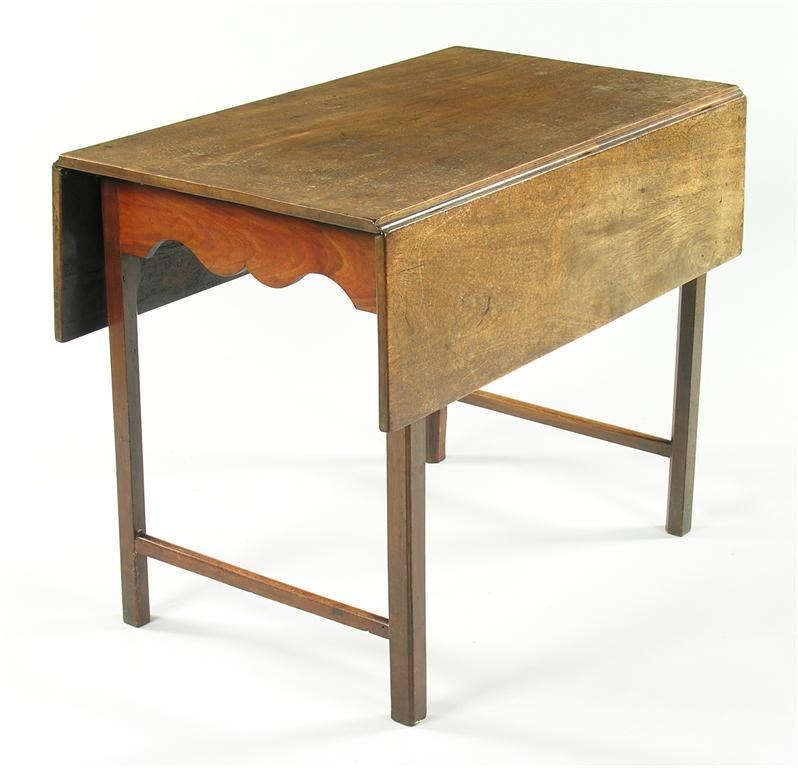 A George III mahogany Pembroke table, with serpentine end friezes on moulded chamfered square legs, 29in (73.7cm) h, 22.5in (57cm) w, closed, 36.75in (93.2cm) d.