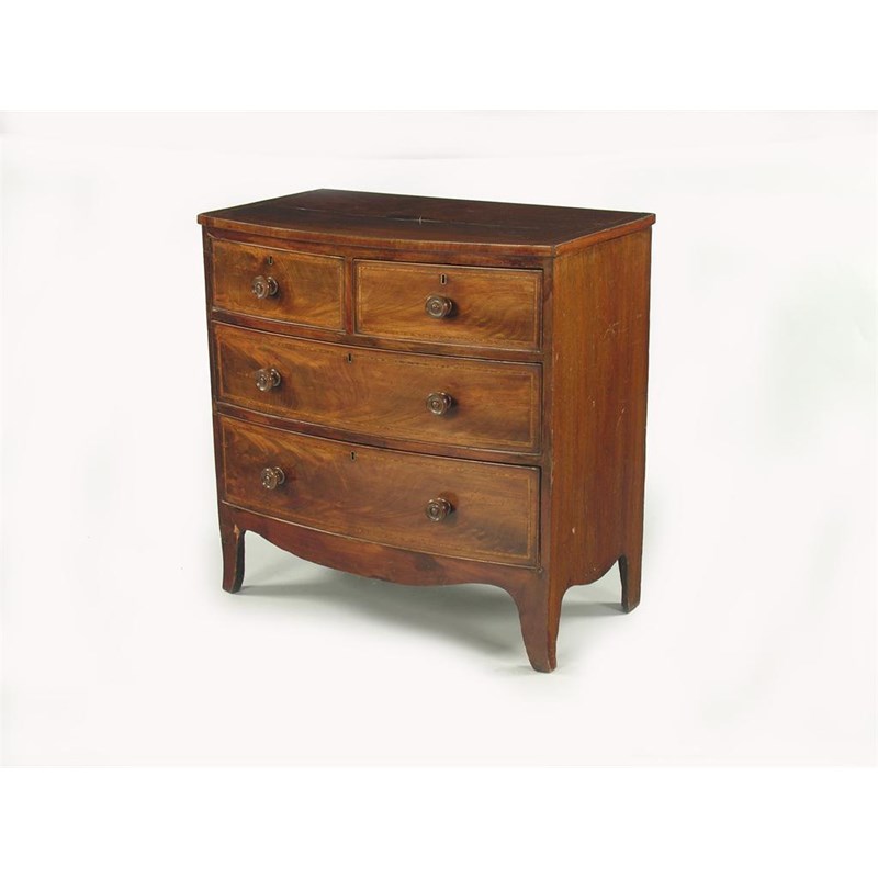 A 19th century mahogany small bowfront chest, the top inlaid stringing above satinwood banded drawers fitted replaced wood knob handles, 34.75in (88.2cm) h and w, 20in (50.8cm) d.