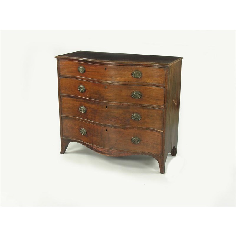A late George III mahogany serpentine front chest, the applied moulded edge top above four long graduated drawers fitted oval brass plate handles, 40.5in (103cm) h, 45in (114.3cm) w, 22in (56cm) d.
