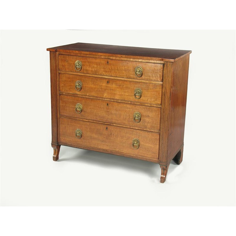An early 19th century mahogany chest, the four long fiddle back drawers fitted brass ring handles, flanked by inlaid faux fluted pilasters, on scroll feet, 39.5in (100.2cm) h, 43.25in (110cm) w, 21.5in (54.6cm) d.