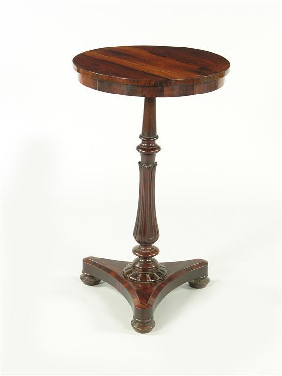 A rosewood and simulated occasional table, the turned and carved extended stem to a triform base, the underside with printed label 'E.W. SAVORY, CARVER OF GILDER ST. JOHN STREET, CIRENCESTER', 30in (76.2cm) h, 17.75in (45cm) dia.