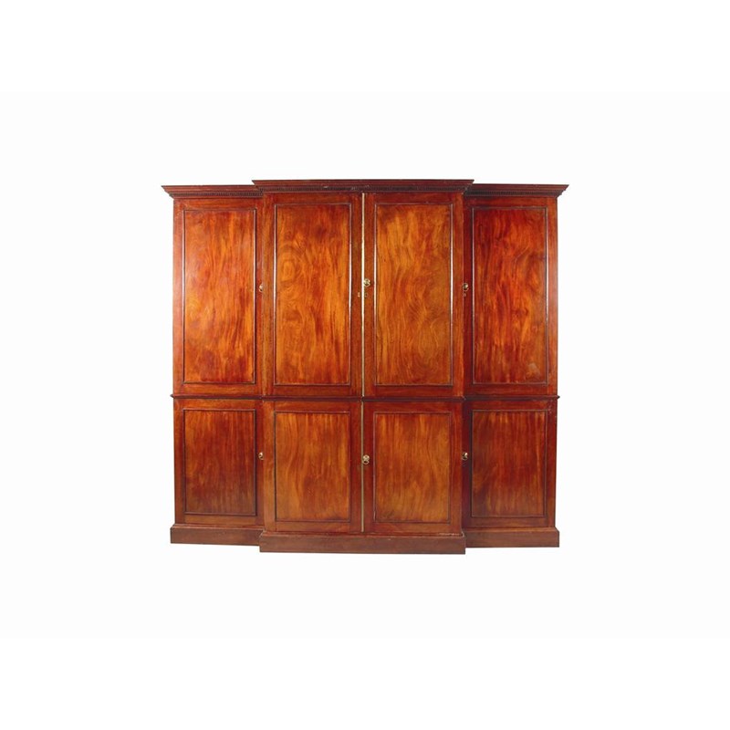 A late George III mahogany breakfront linen press, the detachable dentil moulded cornice above rectangular panel doors enclosing slides and shelves, 90.5in (230cm) h, 102in (259cm) w, 27in (63.5cm) d.