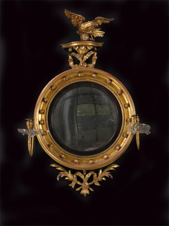 An early 19th century giltwood and gesso convex girandole, with bracket eagle surmount, the scroll arms with gilt brass holders and glass drip pans, 31 x 23in (79 x 58.5cm).