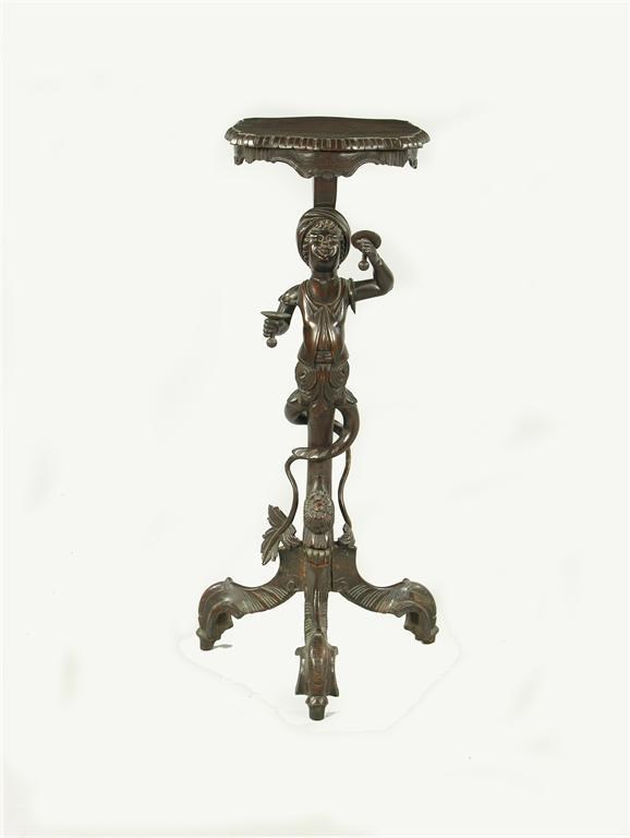 A Venetian carved walnut blackamoor, with a shaped veneered top, late 19th/early 20th century, 36.25in (92cm) h, 17in (43cm) w.