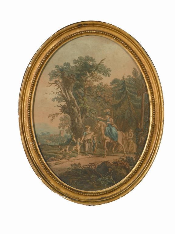 A hand coloured engraving, a lady on horseback giving to a poor family, 14.5 x 11in (37 x 28cm).