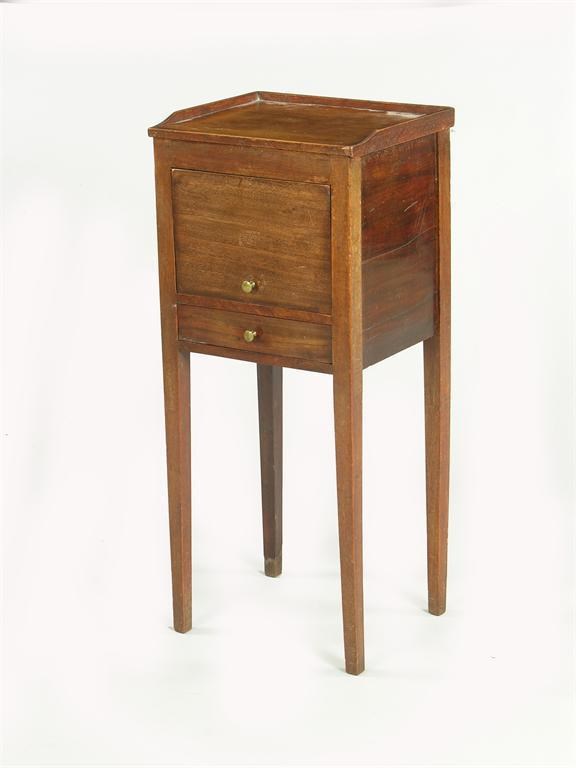 An early 19th century mahogany bedside cupboard, with a lift-up door and frieze drawer, 30.75in (78cm) h, 13.25in (33.5cm) w, 11in (28cm) d.