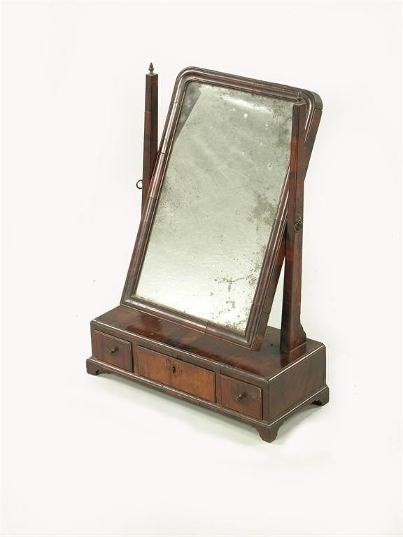 A George II walnut dressing table mirror, 23.5in (59.6cm) h, 17.75in (45cm) w, 7.5in (19cm). Right upright restored.
