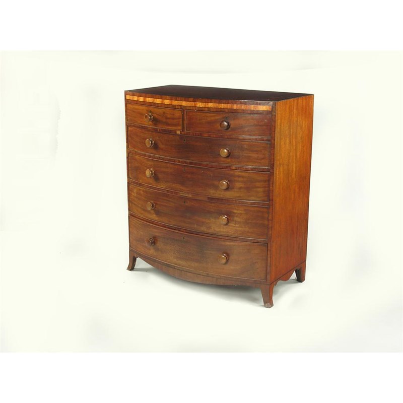 A George IV mahogany bowfront chest, the cross banded top with ebonised stringing to a satinwood banded frieze above two short and four long graduated drawers, 47.25in (120cm) h, 43.5in (110.5cm) w, 23.75in (60.2cm) d.