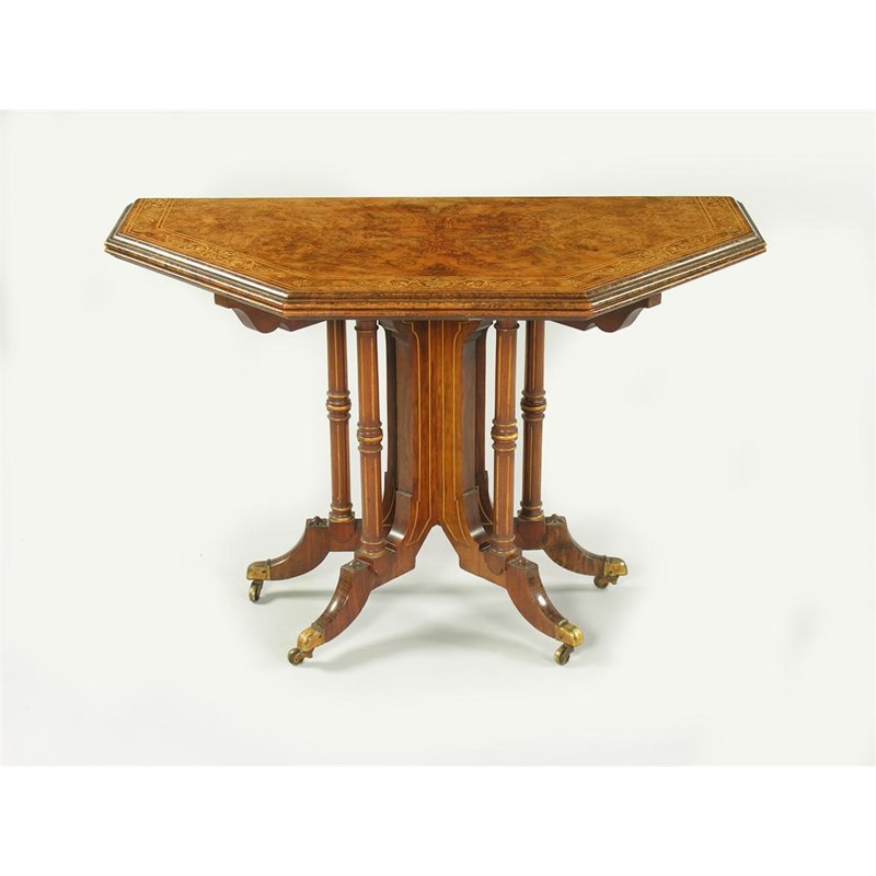 A Victorian walnut hexagonal card table, the burr veneered top inlaid marquetry banding, sliding forward and hinging to a baize lining, on a quatreform hinged base with gilt lines incised highlights, the floret capped scroll legs to brass castors, 30in (76cm) h, 42in (106.6cm) w, 21in (53.6cm) d.