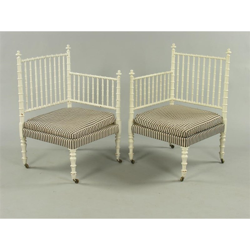 A pair of late Regency turned wood corner chairs, later painted with squab cushions and on brass castors. (2) Provenance; Sir Cecil Beaton, Reddish House, Broad Chalke, Wiltshire, Christie's 9th June 1980, Lot 134.