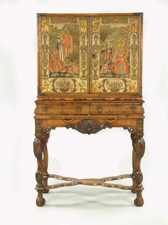 A walnut cocktail cabinet, brass bound, with a pair of needlework panel doors depicting Elizabethan figures in garden landscapes, enclosing a glass shelf, the base with a pair of frieze drawers and a mirrored slide, to a carved apron and supports, 63.25in (160.6cm) h, 36.5in (90.6cm) w, 18.5in (47cm) d.