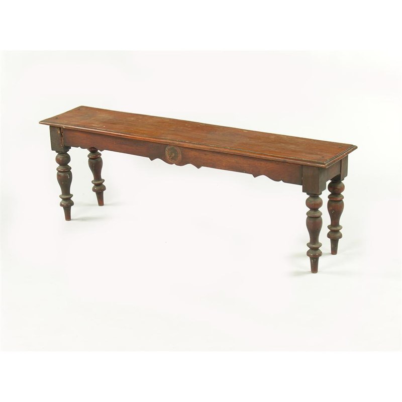 A Victorian mahogany hall seat, the rectangular moulded edge top previously with bolster ends, 16.75in (42.5cm) h, 48.5in (123.2cm) w, 10.75in (27.3cm) d.