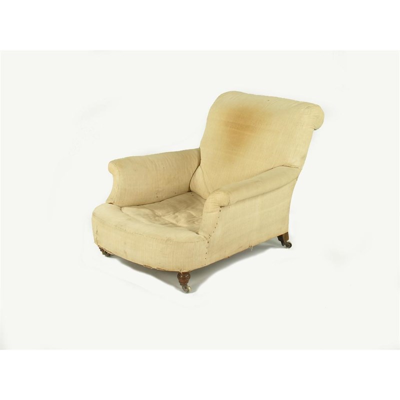 Howard & Sons. A late Victorian easy armchair, on turned walnut legs to brass castors, the back castors stamped 'HOWARD & SONS, LONDON', one back leg stamped '12548 4070', the front castors stamped 'COPES PATENT'.