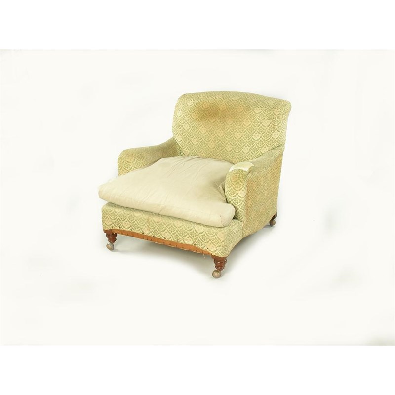 Howard & Sons. A late Victorian easy armchair, with original initialled ticking on turned walnut legs, one back leg stamped '17617, 9695 HOWARD & SONS LTD, BERNER ST', with later shepherd castors.