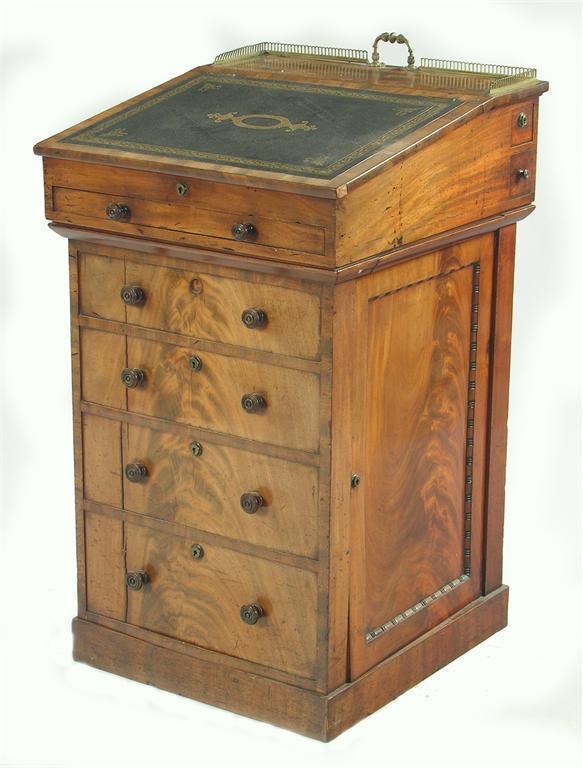 A George IV mahogany Davenport, the forward sliding top with a partitioned interior to sliding tray and lidded compartments, the galleried back with a central handle, sliding to reveal ink and pen compartments, the sides with further pen and ink compartments to a divided frieze drawer, the front with false drawer, the side doors enclosing four drawers with sunken brass handles, the right side with a shelf, Bramah locks, 36.5in (92.6cm) h, 20.75in (52.7cm) w, 21.5in (54.5cm) d. The drawer linings are either mahogany or cedar, many of the compartments having loose leather covered covers.