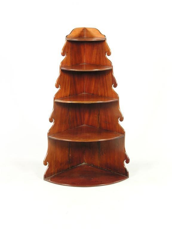 A mahogany bowfront corner tagre, of graduated form, 19th century and later, 41.25in (104.6cm) h, 24in (61cm) w, 17in (43cm) d.