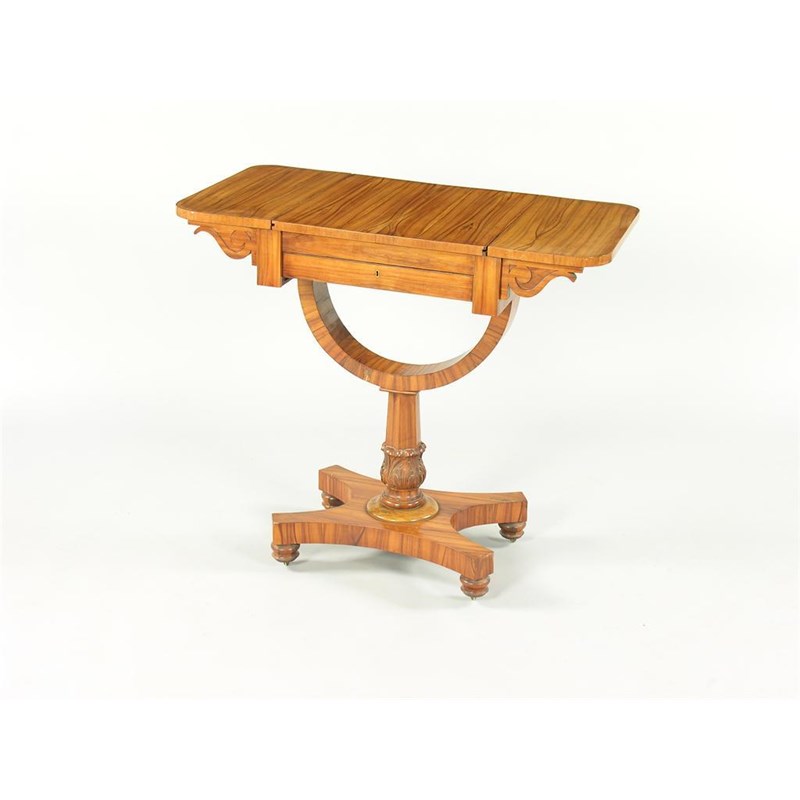 An early 19th century coromandel games/sewing table, the reversible slide with a chequer board to a backgammon board, the frieze drawer part divided, previously with a bag, 30.5in (86.3cm) w, 18in (45.6cm) d.