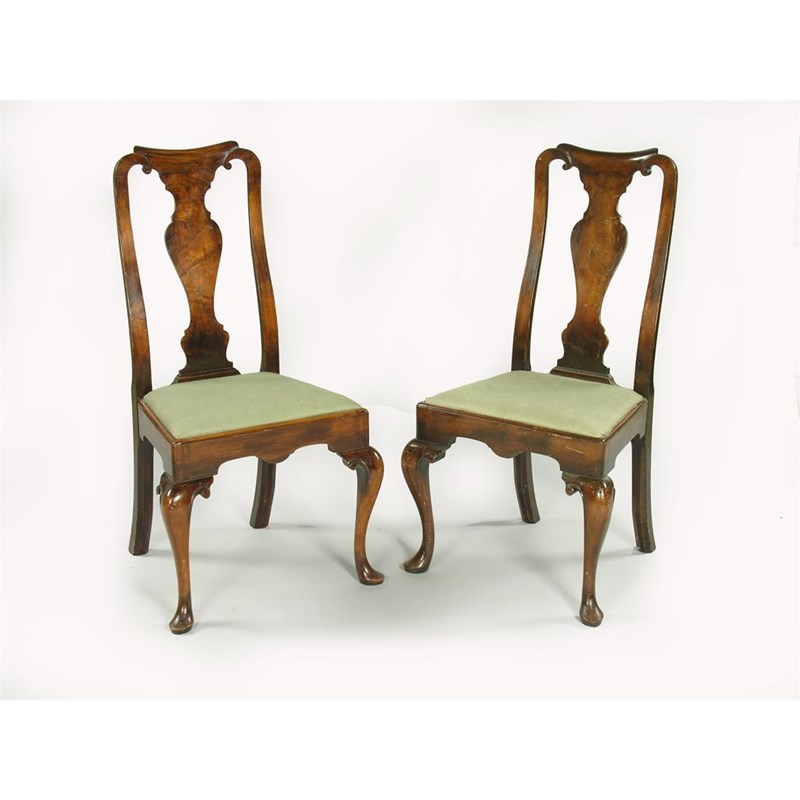 A set of six walnut George I style side chairs, with simulated decoration and drop-in seats. (6) Provenance: Formerly at Fonthill House, Nr. Tisbury, Wiltshire.