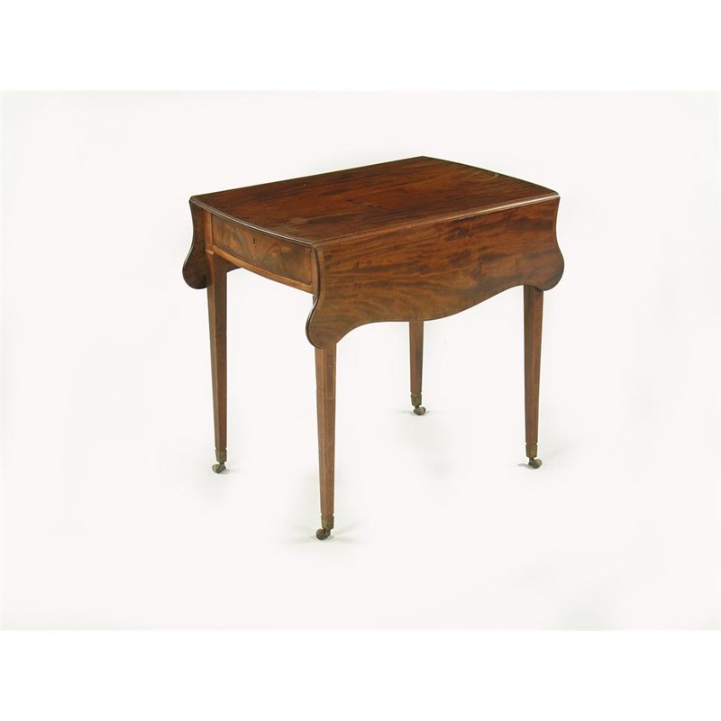 A George III mahogany Pembroke table, the crossbanded serpentine top above an end frieze drawer to panel veneered square tapering legs, on leather roller castors, 27.75in (70.5cm) h, 20.75in (52.8cm) w closed, 30.25in (77cm) d.