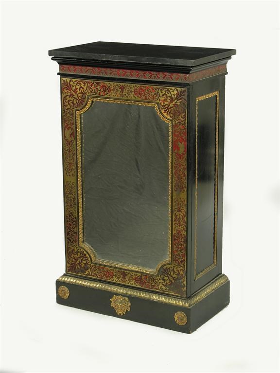 A 19th century 'boulle' side cabinet, the polished slate detachable top above a mirror panel door with foliage and squirrel decorated borders, enclosing three shelves, 40in (101.6cm) h, 24in (61cm) w, 13.25in (33.5cm) d.