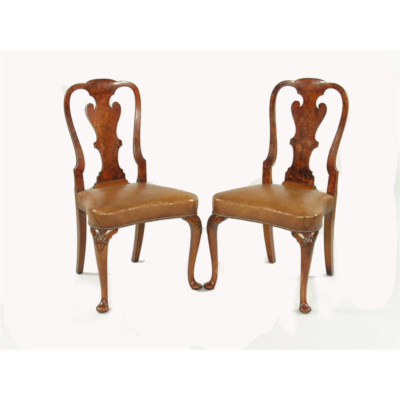 A pair of walnut side chairs in George I style, with burr walnut backs, early 20th century. (2)