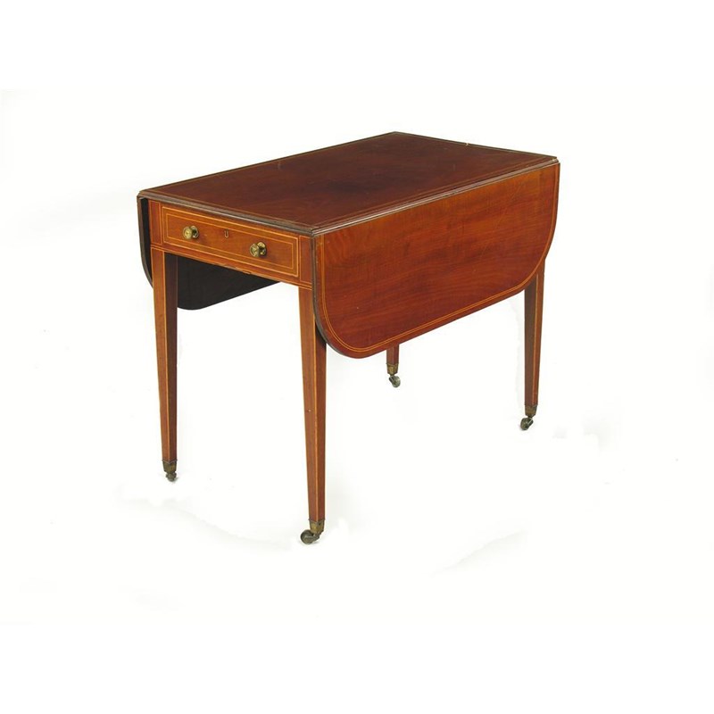 A 19th century mahogany Pembroke table, with twin boxwood stringing, and a moulded edge top, above a frieze drawer, 28.75in (73cm) h, 21.25in (54cm) w, closed, 36in (91.4cm) d.