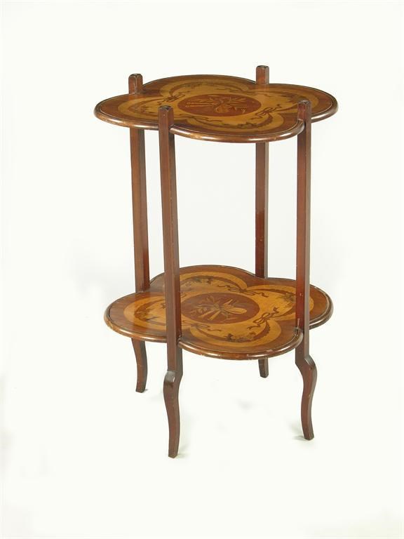 A mahogany satinwood and marquetry inlaid two tier tagre