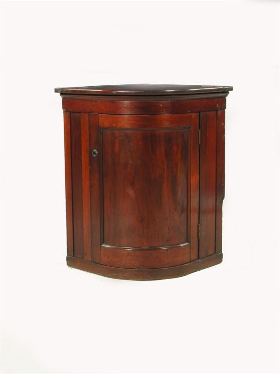 A 19th century mahogany corner washstand, the hinged top to a vacant interior, the panel door enclosing a shelf, 33in (84cm) h, 32in (81cm) w, 27in (68.5cm) d.