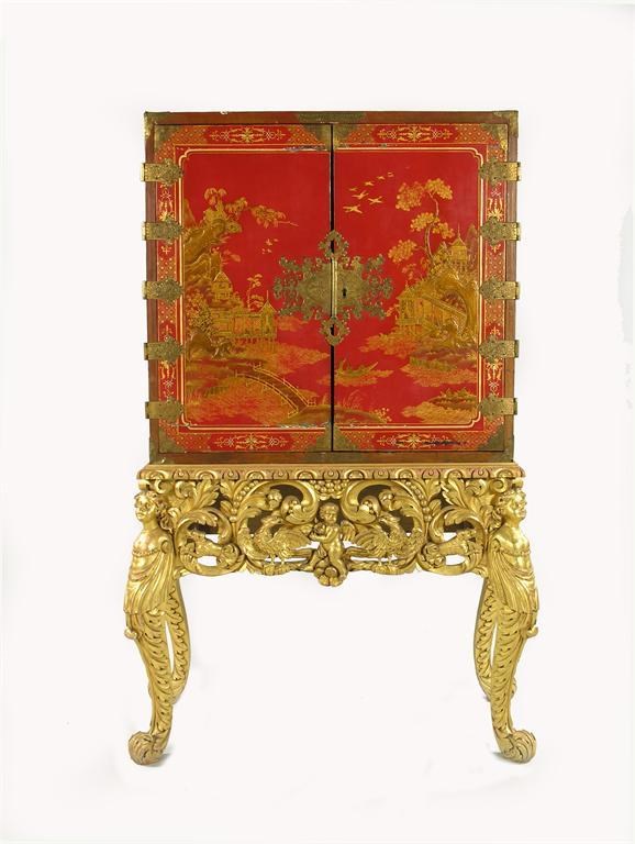 An 18th century red japanned cabinet on a later carved giltwood stand, the cabinet with engraved gilt brass mounts, the pair of doors decorated palaces and figures in a river landscape, to an arrangement of eleven drawers fitted cast gilt brass handles, the stand carved a central cherub with eagles and hounds on monopodia supports, 68in (173cm) h, 43.5in (110.5cm) w, 22.75in (58cm) d. The drawers have been re-lacquered and the handles replaced. Provenance: Formerly at Fonthill House, Nr. Tisbury, Wiltshire.