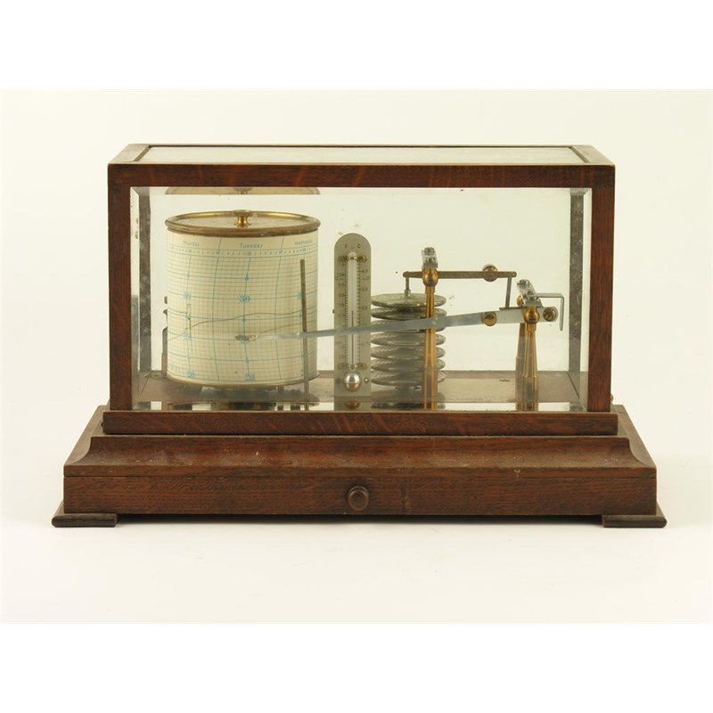Negretti & Zambra. An oak cased barograph, the seven tiered vacuum to lacquered brass supports, ink pot and thermometer, the bevelled glazed hinged cover to a chart drawer, 8.5in (21.5cm) h, 14.25in (36cm) w, 8.75in (22.2cm) d.