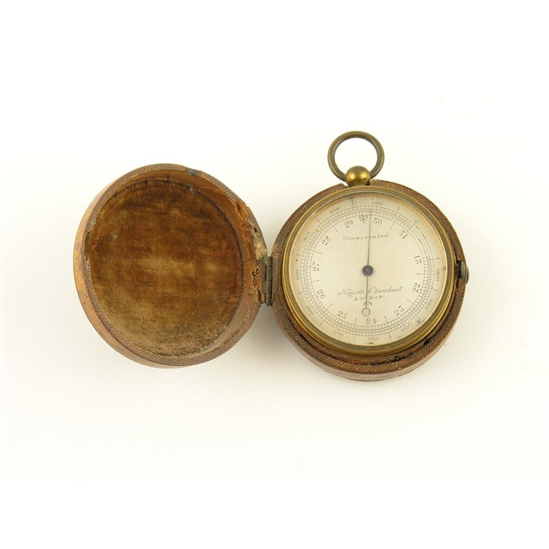 A brass cased pocket aneroid barometer, the silvered dial inscribed 'Negretti & Zambra, London, 876,' with rotating needled bezel, 2in (5cm) dia. in leather case.