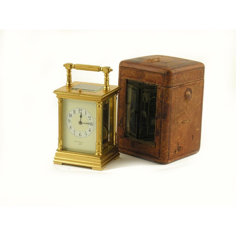 A French brass cased repeating carriage clock, the replaced platform lever escapement striking on a gong, stamped 'E.M&Co' (Maurice & Co) to a painted enamel dial, inscribed 'RUSSELL LTD, 3459, PARIS,' 6.25in (16cm) h, in original travelling case, with key.