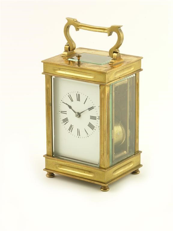 A French brass cased repeating carriage clock, the platform lever escapement striking on a gong to an enamel dial, 7in (18cm) h.