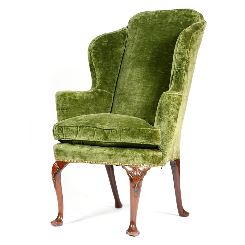 A George II red walnut wing armchair, later upholstered with green plush fabric, on shell and husk carved cabriole front legs and trefid feet.