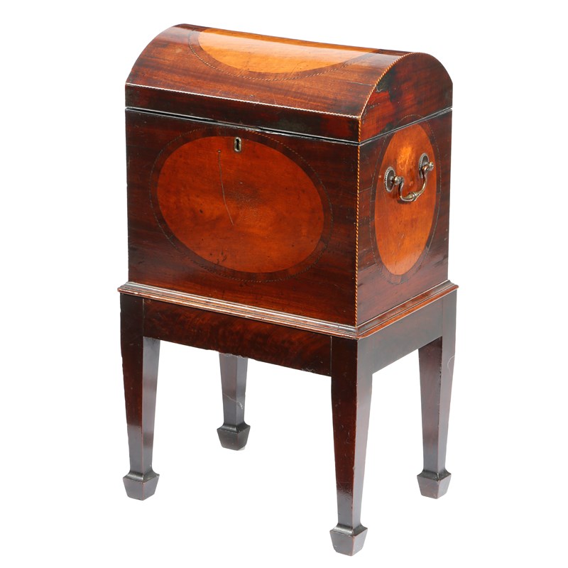 A George III mahogany teapoy, inlaid with barber's pole stringing and with satinwood oval panels, the domed hinged top revealing a later converted interior with four lidded divisions, originally with divisions for wine bottles, with brass side carrying handles and on square tapering legs and spade feet, with branded mark 'F R', 71cm high, 42cm wide, 29.6cm deep.