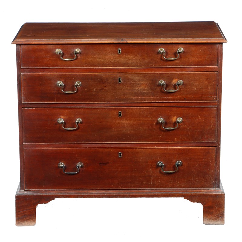 A George III mahogany chest, the top with an applied moulded edge, above four long graduated drawers with original brass swan neck handles, on bracket feet, 83cm high, 91cm wide, 47.4cm deep.
