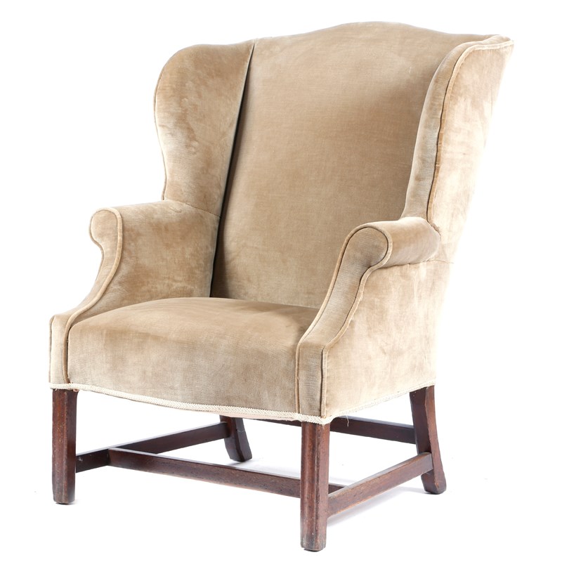 A George III mahogany wing armchair, later upholstered with plush fabric, with a serpentine front seat, above moulded front legs united by 'H' stretchers.