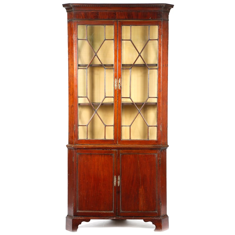 A George III mahogany standing corner cupboard, the dentil cornice above a pair of astragal glazed doors, enclosing two shelves, above a pair of panelled doors, enclosing a shelf on bracket feet, 221.6cm high, 108.3cm wide, 51.6cm deep.
