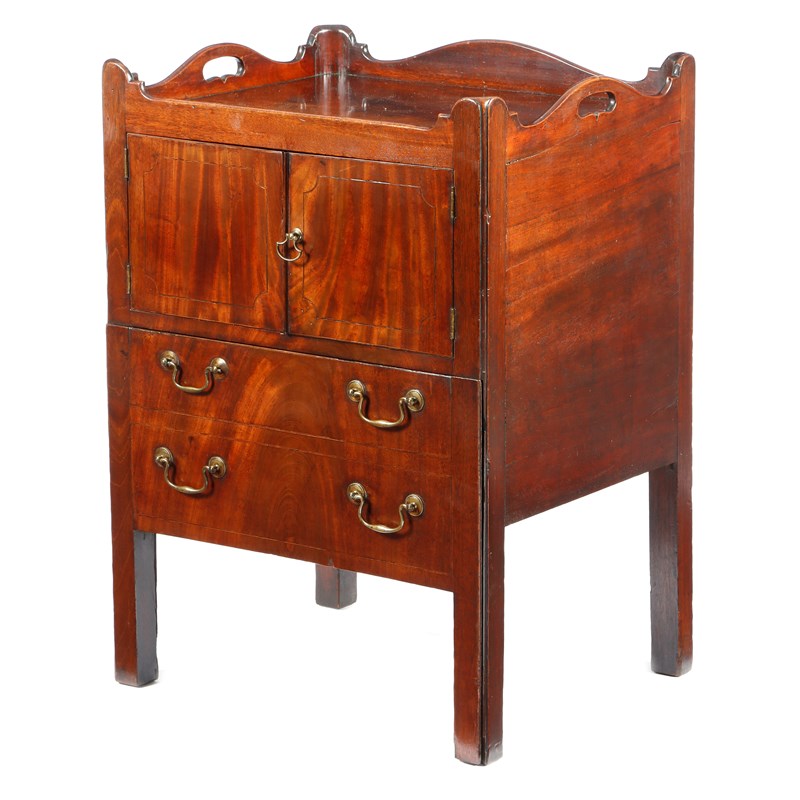 A George III mahogany tray-top bedside commode, the serpentine gallery pierced with two handgrips, above a pair of cupboard doors and a pull-out converted base, 77.5cm high, 55.8cm wide, 45.3cm deep.
