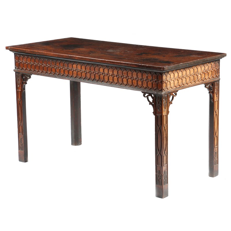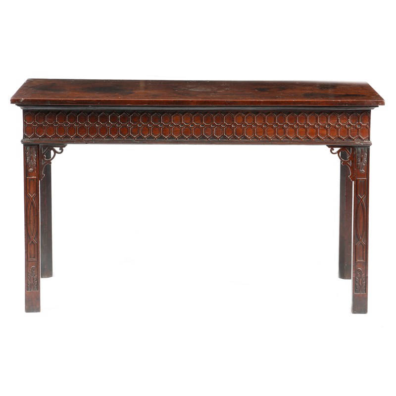 A George III mahogany serving or side table in Chippendale style, the rectangular top above a Gothic blind-fret carved frieze, on leaf carved and fret chamfered legs with applied pierced brackets, 77cm high, 129.5cm wide, 60.5cm deep.