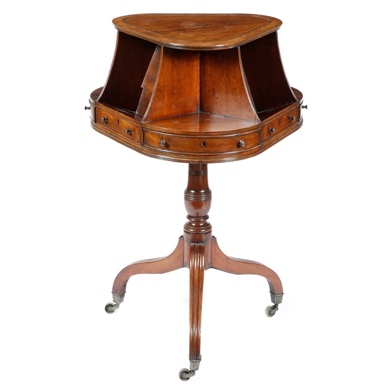 An unusual mahogany library bookstand in Regency style, the revolving top with three corner shelves, three troughs and three hinged drawers, on a ring turned baluster stem and reeded scroll legs and brass caps and castors, possibly Irish, 94.2cm high, 62cm wide.