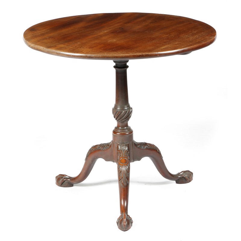 A George II mahogany tripod table, the circular tilt-top on a fluted urn turned stem, on leaf and cartouche capped cabriole legs and claw and ball feet, on sunken leather roller castors, 70.4cm high, 76.9cm diameter.