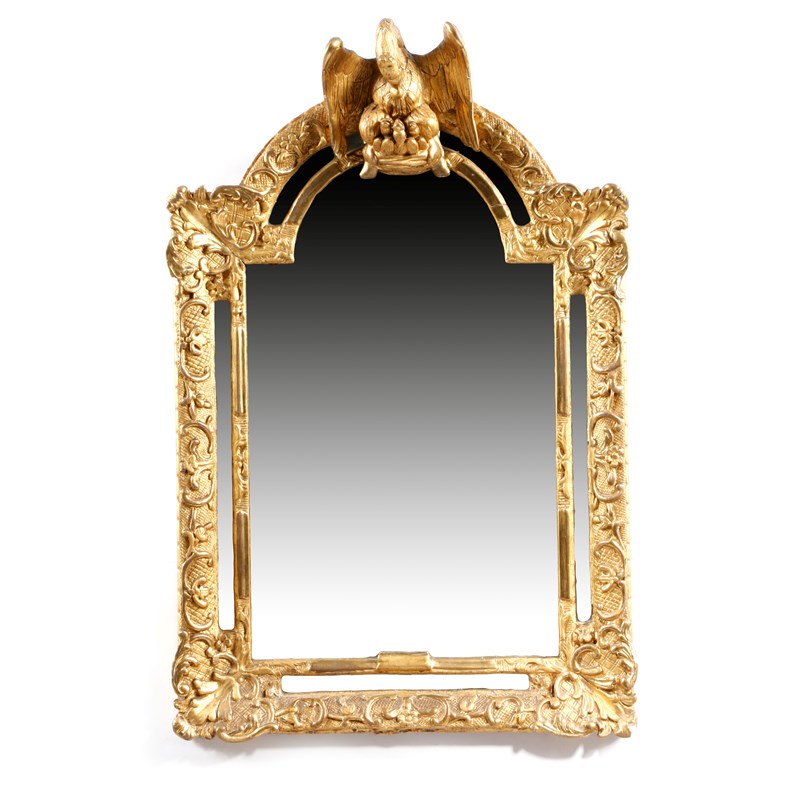 An 18th century giltwood wall mirror, the later arched plate with further marginal plates, within a leaf and flower carved frame on a diaper ground, with a bird surmount feeding her chicks, French or Italian, 88.5 x 57cm.