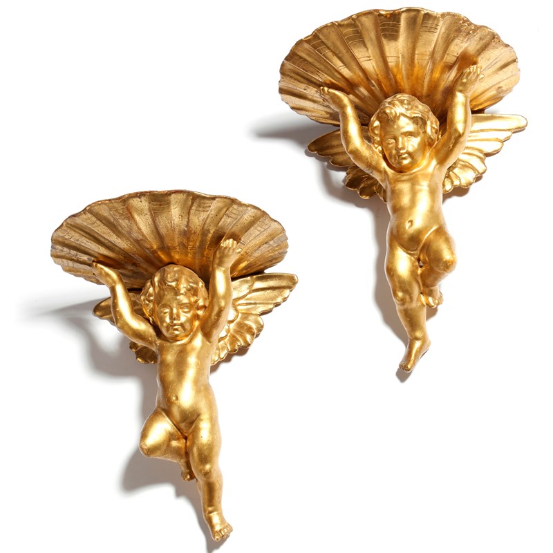 A pair of 19th century Italian giltwood wall brackets in Baroque style, each in the form of a winged cherub supporting a shelf, 21cm high, 17.5cm wide. (2)