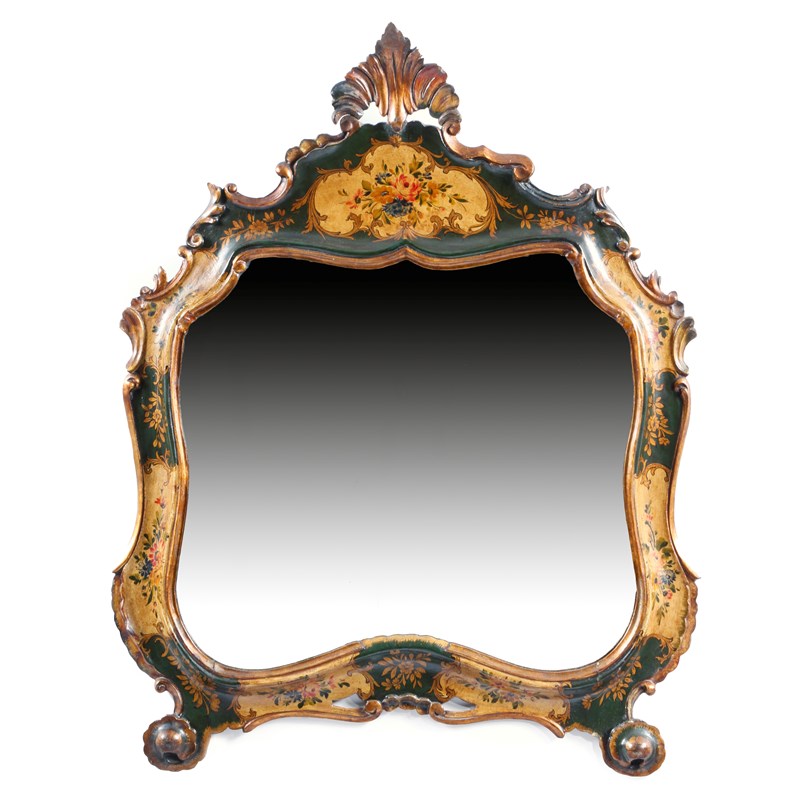 An Italian green japanned wall mirror in Rococo style, the shaped plate within a moulded frame, with leaf scrolls and painted panels of flowers, probably Venetian, late 19th century, 92.5 x 74cm.