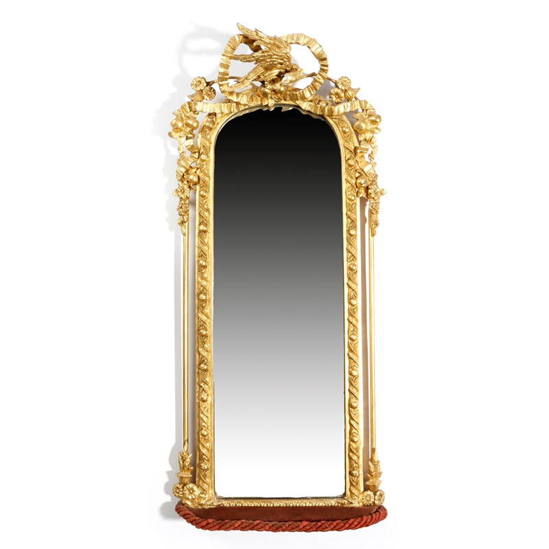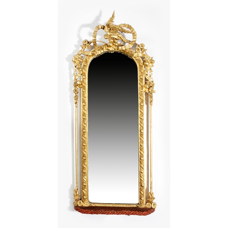 A pair of late 19th century giltwood and gesso pier mirrors, each with a later arched plate within ribbon and fruit frames, with an eagle surmount flanked by ribbon tied garlands of fruit and flowers, the base with a velvet covered shelf, 113 x 48cm. (2)
