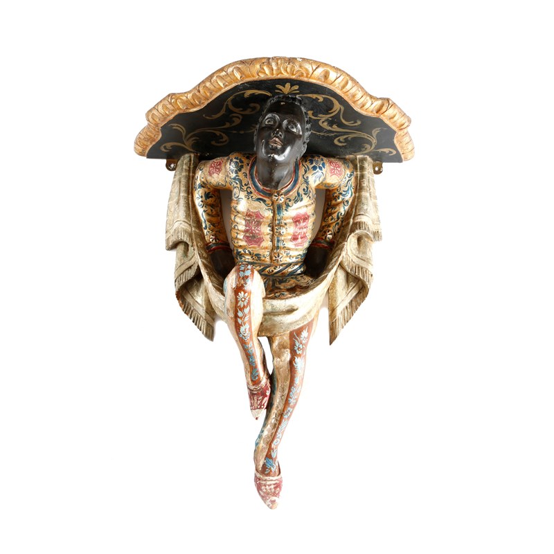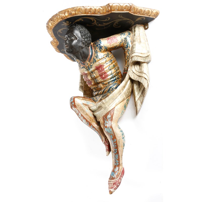 A late 19th century Italian Venetian carved wood wall bracket, in the form of a blackamoor Harlequin figure, with silvered, gilt and polychrome decoration, 57.2cm high, 46.5cm wide, 27.6cm deep.