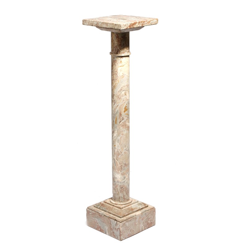An Italian red veined marble column, with a detachable square top, above a turned stem and a stepped plinth, 106.4cm high, 25.2cm square.