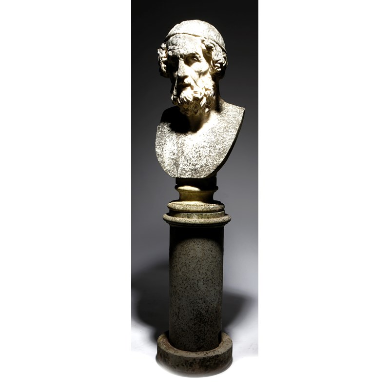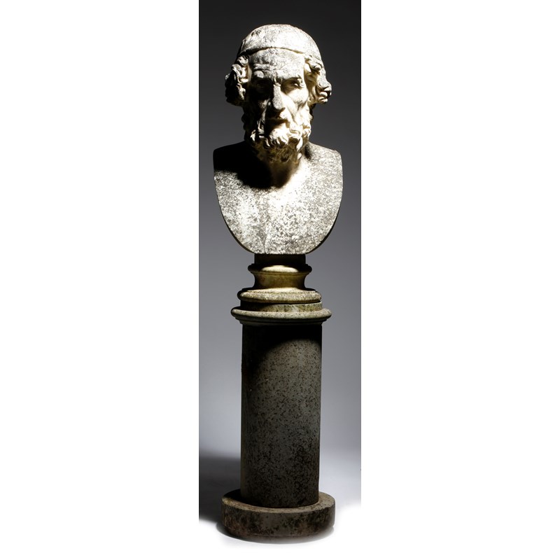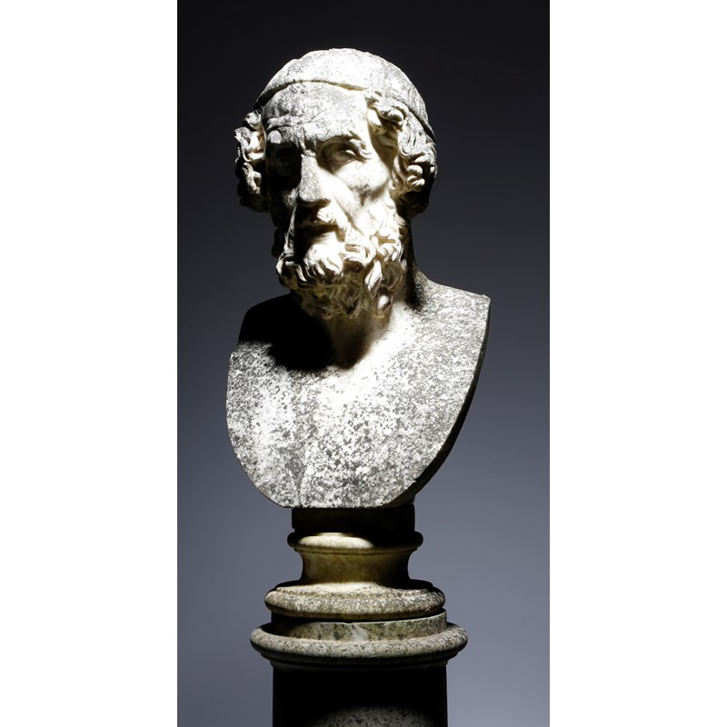 After the antique. An early 19th century Italian white marble Grand Tour bust of Homer, with a weathered patination, signed 'Franco Franchi copia in Carrara', 58cm high, on a socle and plinth base, 124.5cm high (overall).